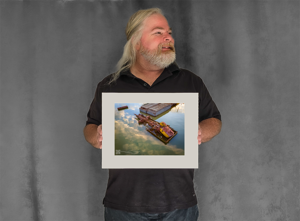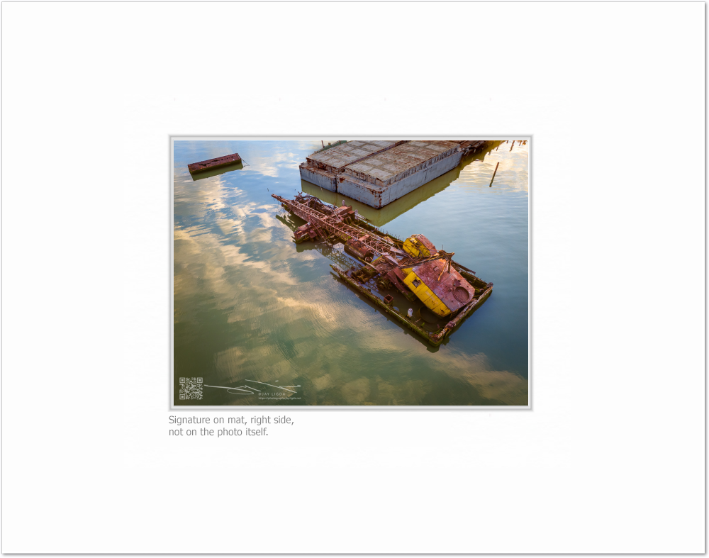 An aerial view of the Benicia landmark junk crane. The clouds above are reflected in the calm waters below.