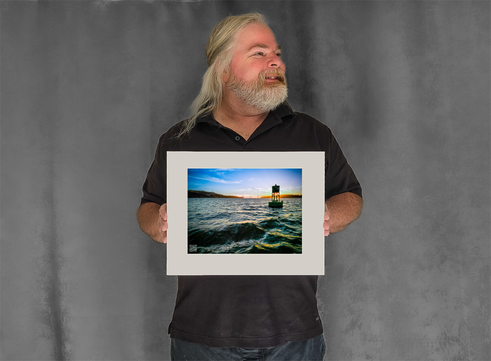 A photograph taken in 2023 with a drone hovering a few feet over the water near Benicia, CA, capturing Buoy 21A over the Carquinez Strait.