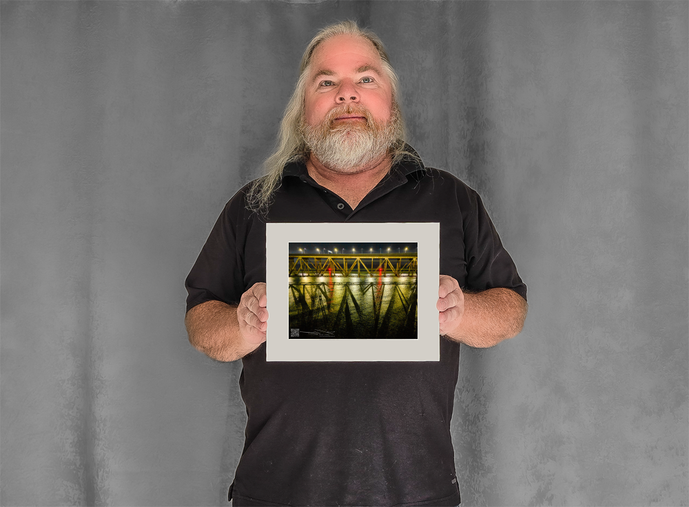 The spectacular shadows of a truss bridge spill across the water and the light behind it illuminate the bridge at night. A photograph of Benicia, CA.