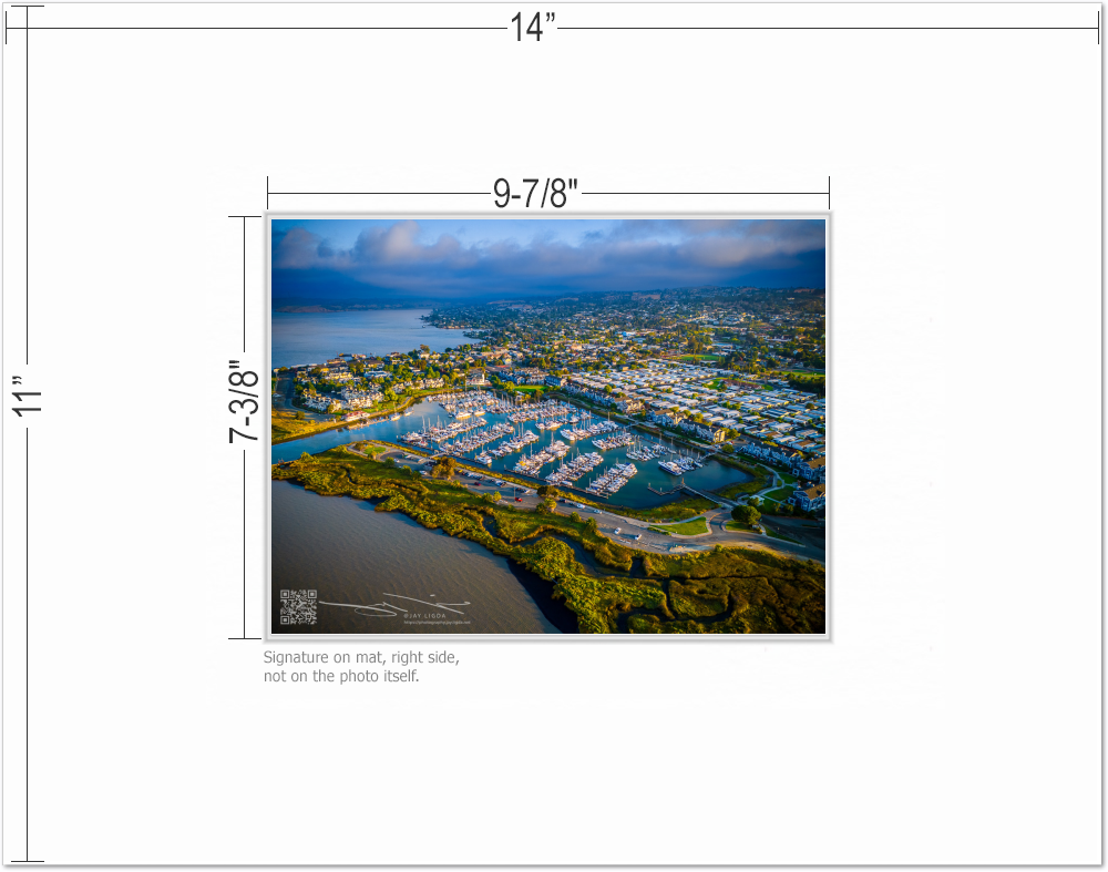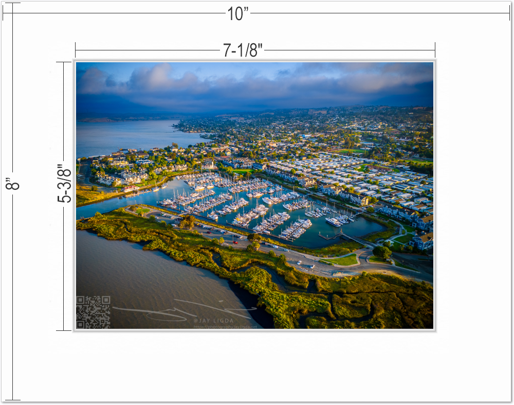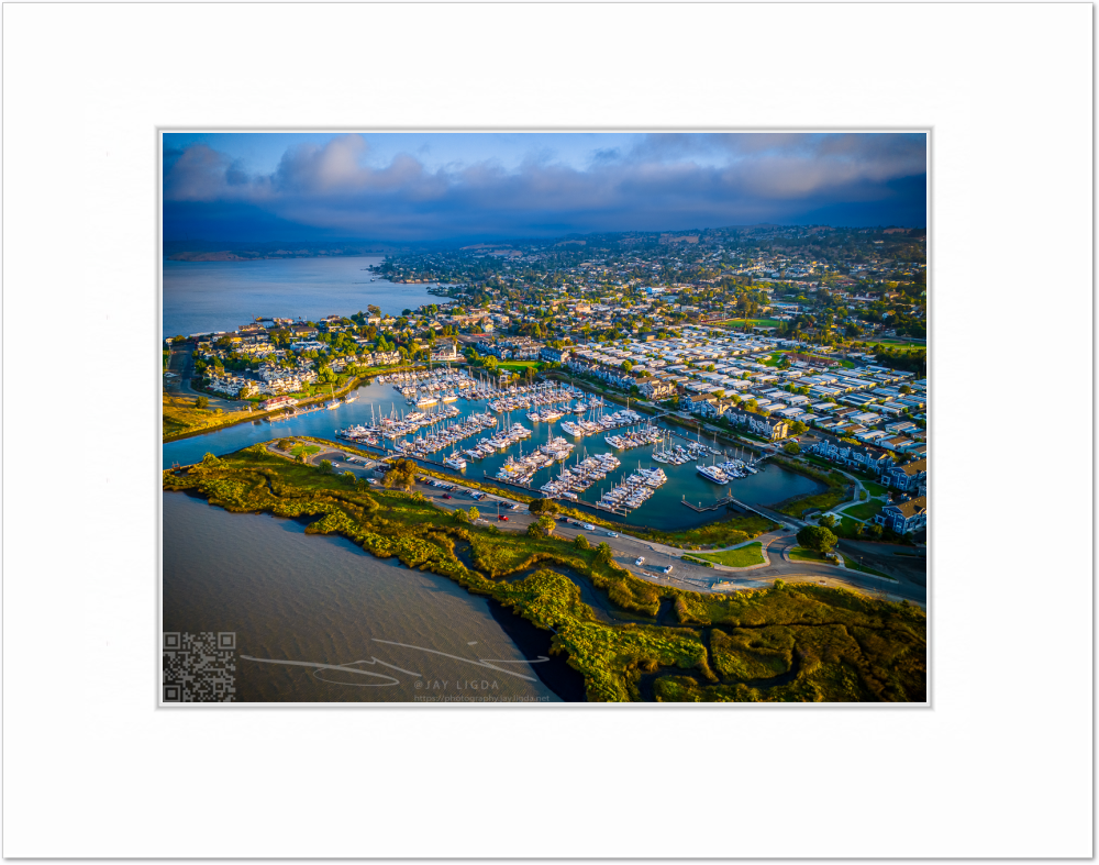 From a high vantage point, the morning sun illuminates the boat docks at Benicia Harbor. The city of Benicia stretches out in the background, gradually awakening with the dawn.