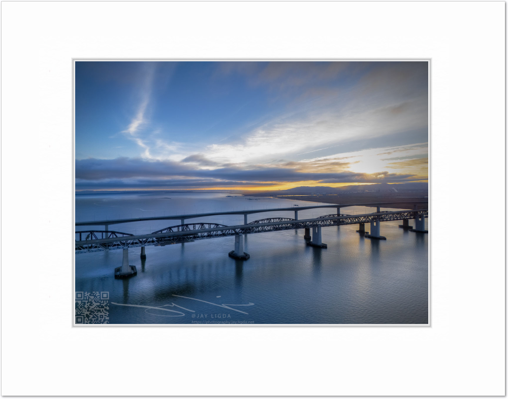 The sun rises beyond the Benicia Martinez Bridge. The wispy white clouds for the shape of a lightning strike.