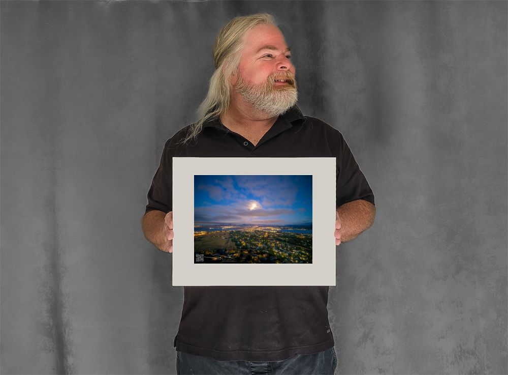 Mount Diablo is shrouded in fog as the moon rises behind the clouds above the mountain. Below, the lights of the city and bridge twinkle softly.