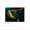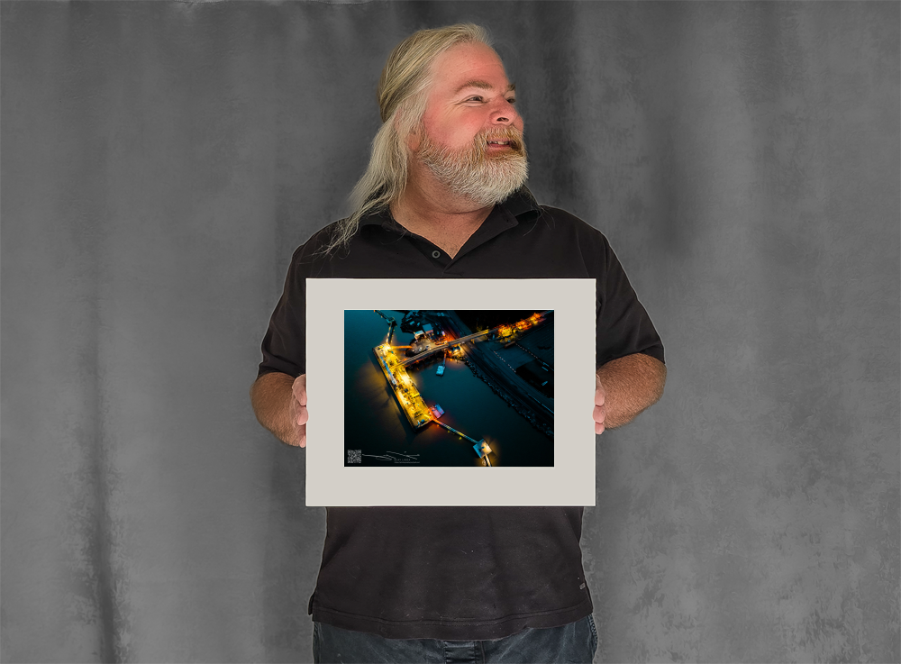 A dock glows in this aerial night view, casting shadows across the dark water beyond, as if waiting for a tanker to arrive.