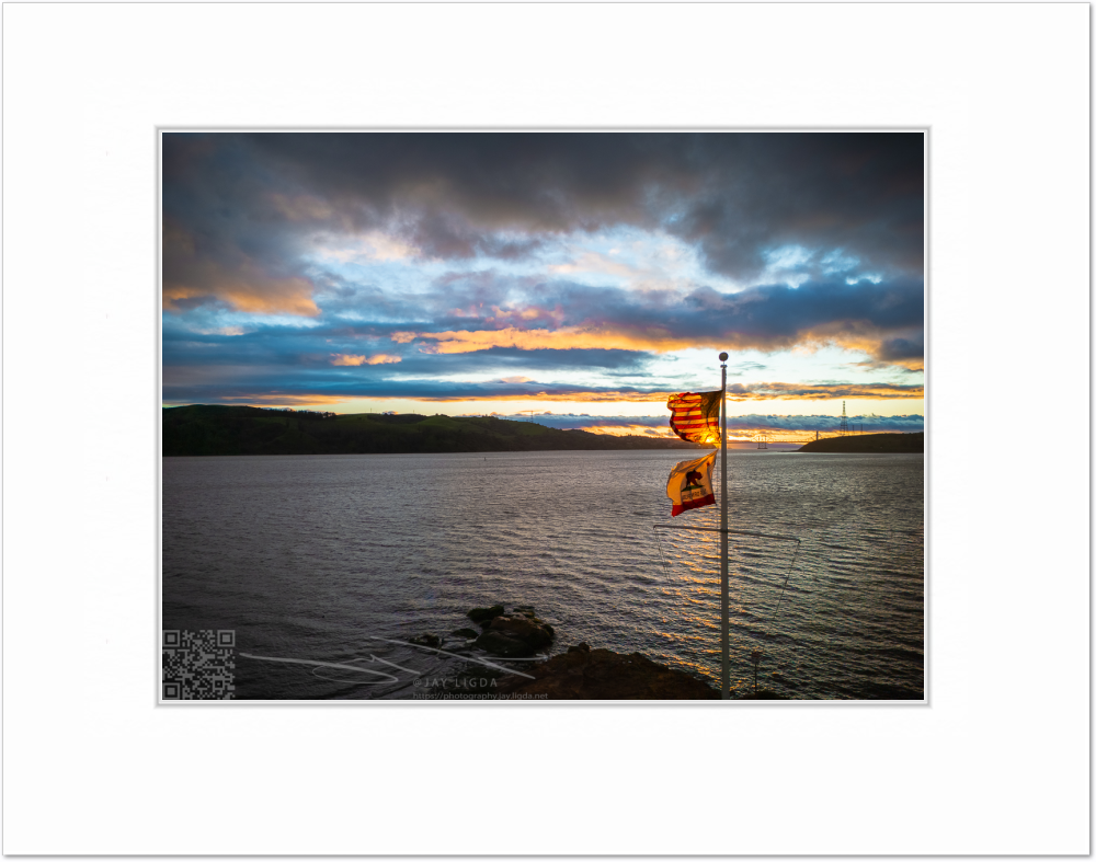 As the sun sets beyond flags whipping in the wind, the sky above fades into soft layers of gray, white, yellow, and blue.