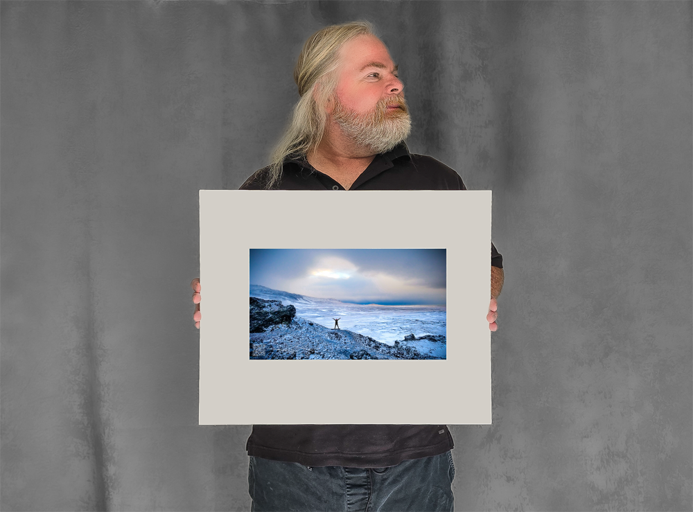 A man opens his arms, taking in the scene atop a snowy mountain. An inspirational photograph.