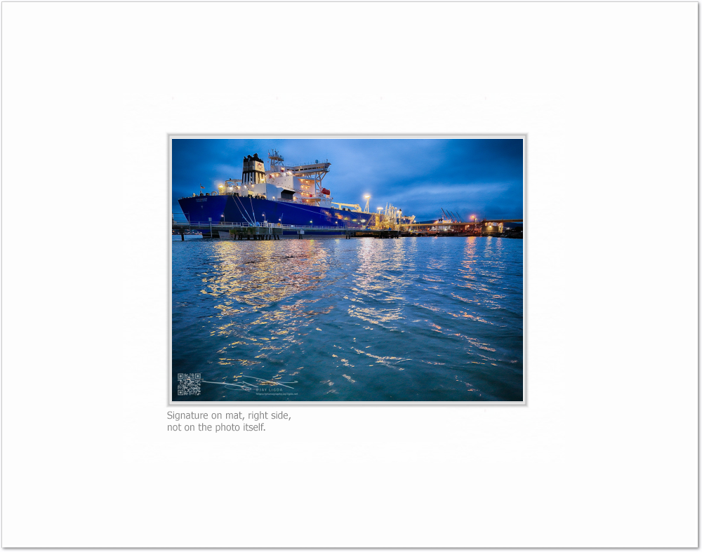 A tanker is moored at a pier in Benicia, CA, its lights reflecting off the water in the quiet dawn as the sun is about to rise.