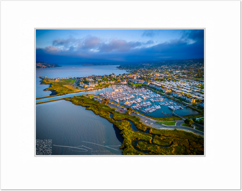 The morning sun illuminates the boat docks at Benicia Harbor. The city of Benicia stretches out in the background, gradually awakening with the dawn.