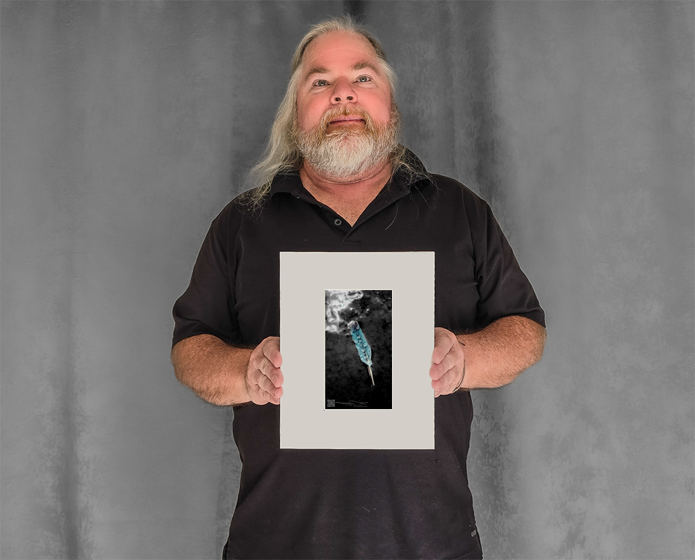 A bright aqua-colored feather rests in water. Reflections resembling smoke. An inspirational photograph.